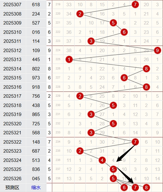 上期跨度为5,近5期跨度开出情况:第25316期开出8,属于偶数,2路号码,木属性;第25323期开出2,属于偶数,2路号码,火属性;第25324期开出4,属于偶数,1路号码,金属性;第25325期开出5,属于奇数,2路号码,土属性;第25326期开出5,属于奇数,2路号码,土属性;