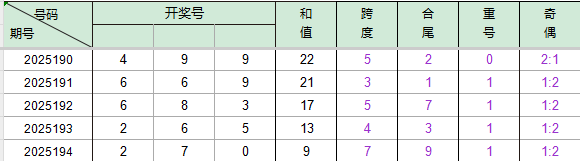 2025190期开奖号码499,我们可以看出近30期百位4出现2次,十位9出现4次,个位9出现4次。