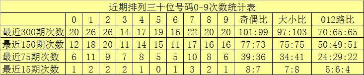 个位分析:最近300期奖号由冷到热表现为:923,625,026,5829,130,231,734,435,338次,该位号码奇偶比为154:146,大小比为140:160012路比为112:99:89