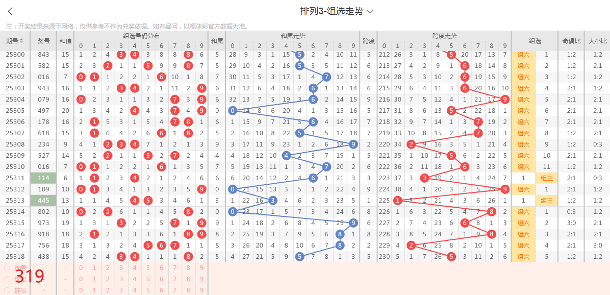 三是技巧与运用; 代码走势图是组号分析的重要工具,它能直观展示代码在历史开奖中的出现频率、遗漏值和连出规律,帮助我们更好地把握号码走势,锁定本期大概率出现的代码组合。当通过代码走势图确定 “最小号或最大号+合值+跨度” 的代码组合后,即可将其转换为具体号码。例如,若研判出的代码组合是 “4-3-5”,根据前文的分组与代码对应关系,对应的便是 “最小号码3456合值13579 68+ 跨度1356789号码。通过这种方式,能将抽象的代码转化为具体的数字属性特征,方便缩小选号范围,提高选号精准度。若想进一步优化,还可结合定胆、杀码、合值、跨度等方法进一步缩水。