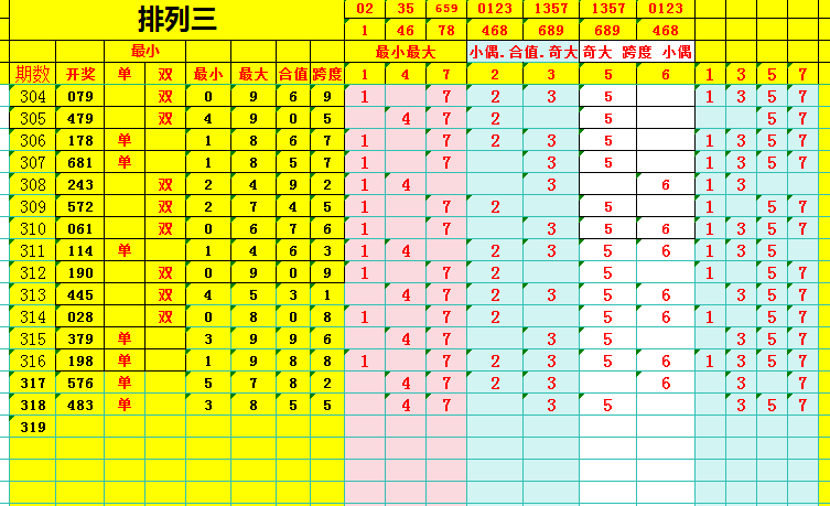 一是把最小与最大号码、合值、跨度进行分类及代码设置; (1)最小最大号码专指一注号码中最小与最大的数字。将 0-9 十个数字分为三组即012-3456-78956;分别用代码1-4-7表示;其中,代码 1 对应数字 012,代码 4 对应3456代码7 对应56789;另外,扩张应用也可以把最小号码按单双、质合分类; (2)合值0-9 按奇(13579)偶(02468)小(01234)大(56789)划分 设定“小+偶”的代码 2 对应0123468 9 ;设定“奇+大”代码为3对应1356789; (3)跨度0-9分按奇(13579)偶(02468)小(01234)大(56789)划分 设定“小+偶”的代码 6 对应0123468 9 ;设定“奇+大”代码为5对应1356789;