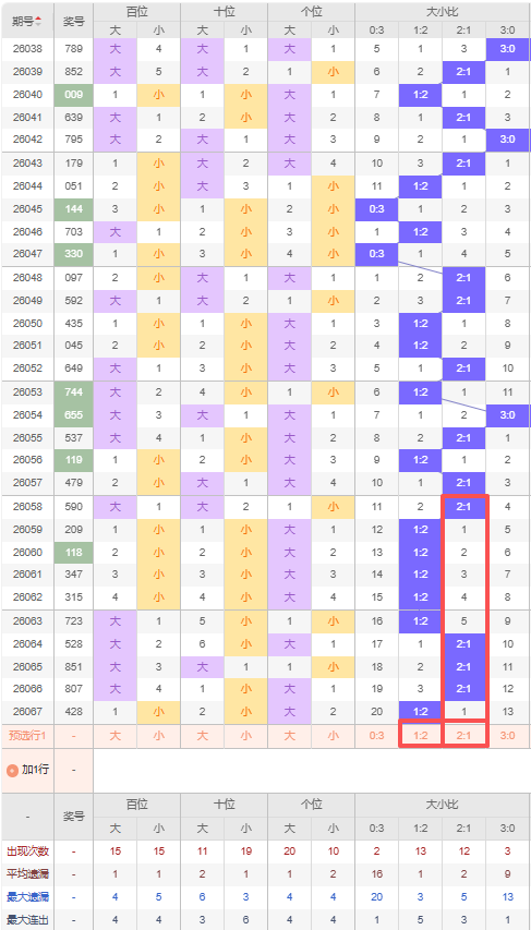 上期大小比:1:2,近10期大小比出现情况:2:1、1:2、1:2、1:2、1:2、1:2、2:1、2:1、2:1、1:2,最近10期出4期2:1,出现6期1:2,出现0期0:3,出现0期3:0,根据近10期出号规律本期推荐连出1:2,防隔期出2:1,综上所述大小比推荐:防:2:1,重点关注:1:2。