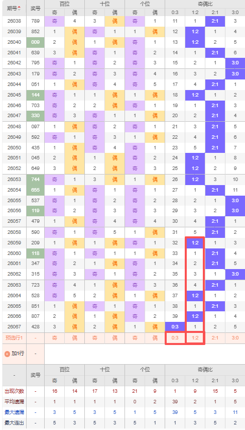 上期奇偶比:0:3,近10期奇偶比出现情况:2:1、1:2、2:1、2:1、3:0、2:1、1:2、2:1、1:2、0:3,最近10期出现5期2:1,出现3期1:2,出现1期0:3,出现1期3:0,根据近10期出号规律本期推荐连出2:1,防隔期出1:2,综上所述奇偶比推荐:防:1:2,重点关注:0:3。