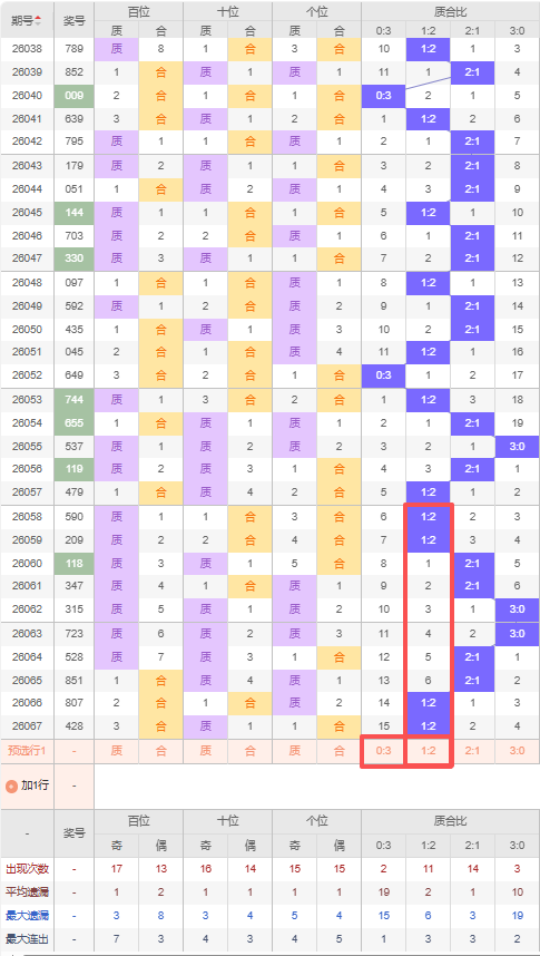 上期质合比:1:2,近10期质合比出现情况:1:2、1:2、2:1、2:1、3:0、3:0、2:1、2:1、1:2、1:2,最近10期出现4期2:1,出现4期1:2,出现0期0:3,出现2期3:0,根据近10期规律本期推荐三连出3:0,防遗漏15期出0:3,综上所述质合比推荐:防:0:3,重点关注:1:2。