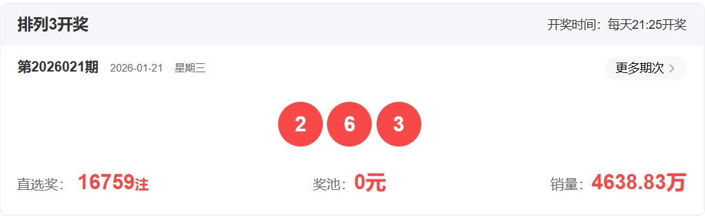 排列三第2026021期开奖回顾:开奖号码:263   形态:组六