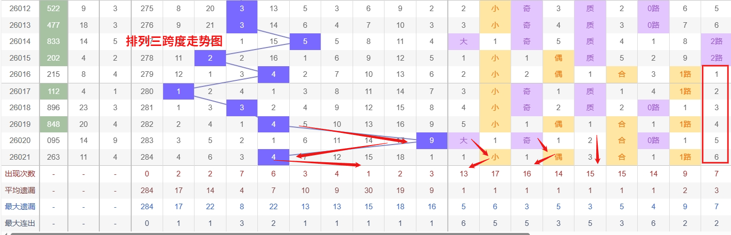 排列三 跨度分析:从上图可以看出近100期的跨度大小比约为52比48,跨度奇偶比约为46比54总体来看还是比较均衡的,但跨度大小之间有点差异。我们再从历史开出4跨后下一期8跨度数据来做参考。最近10期跨度大小比约为4:6期开出大数跨度过多返回小数跨度的概率更高一点。历史开奖近2期出4跨以后的走势为296期开出4跨后下一期走3跨走出1振幅,第307期开出4跨后下一期走2跨走1振幅第313期开出4跨后下一期开出8跨走出4振幅。连续多期小振幅,近期排列三跨度走势分析,跨度8已进入明显的冷态区间,遗漏周期较长,其理论回补压力正在不断累积。虽然短期内尚未出现反弹,但根据跨度的冷热转换规律,任何冷态跨度在达到或接近历史遗漏极值时,往往面临较强的回补需求,因此对跨度8需重点关注其随时可能出现的触底反弹。与此同时,跨度3则表现强势,成为当前的热门跨度,短期内连续或高频出现,形成了明确的热态趋势。热跨度往往具有一定的延续性,因此需防范跨度3的持续走强。出4跨度后容易走出1到4个跨度振幅的对称形态,跨度走出1到4个振幅看好的跨度有2358跨,所以第2026022期排列三跨度推荐2358跨。本文由一起彩钱是生命动力所著,请勿转载