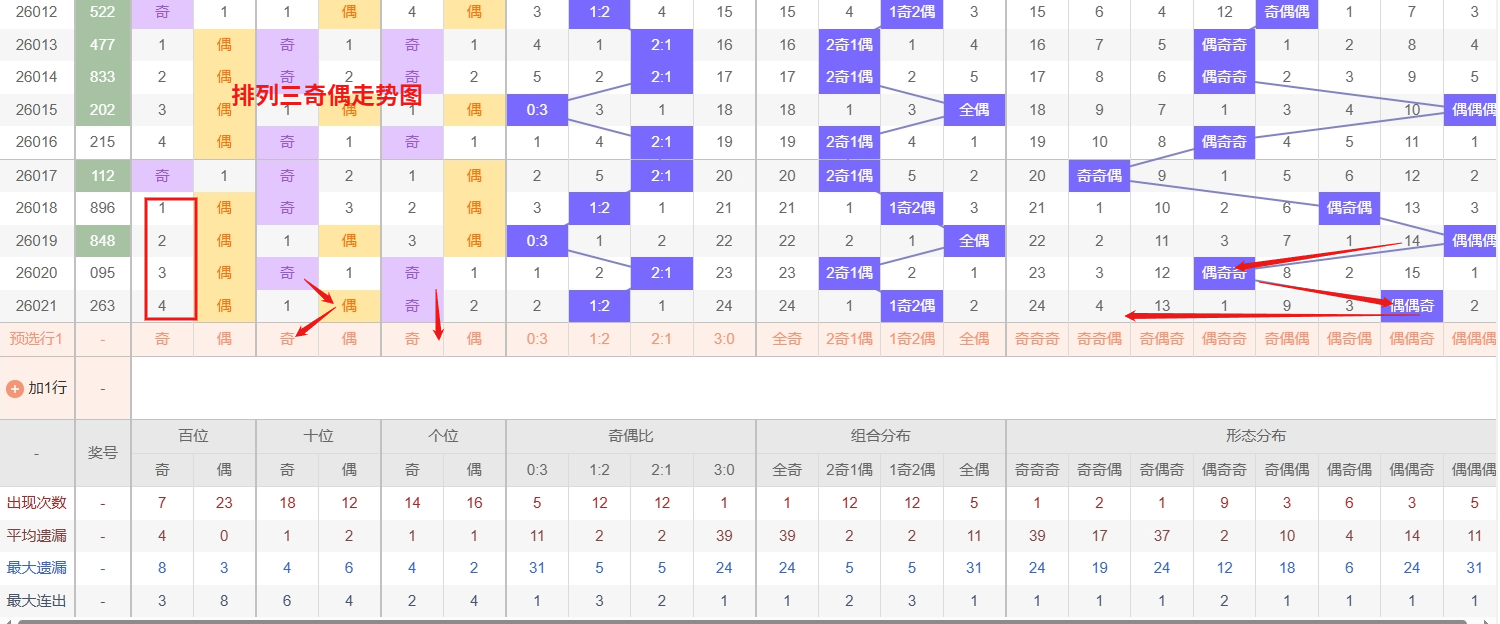 排列三 奇偶分析:从上图可以看出排列三100期内百位奇偶比约为52比48,十位奇偶比为47比53,个位奇偶比为55比45,十位的比值比较均衡,但是个位的比值偏差就有点大,历史奇偶形态近2期开出偶偶奇后下一期的走势为,第292期开出偶偶奇后293期开奇奇偶, 第307期开出偶偶奇后第308期开奇奇奇,第314期开出偶偶奇后第315期开奇偶奇,近期排列三奇偶形态走势来看,“奇奇偶”与“奇奇奇”这两种形态均已进入较长的遗漏周期,呈现出明确的冷态特征。根据奇偶组合的分布规律,任何一种形态在长期隐匿后,其理论出现概率会随着遗漏值的增大而逐步累积回补动能。尤其当整体奇偶比例趋于动态平衡时,这类冷态组合往往具备较强的反弹潜力。所以排列三2026022期奇偶形态推奇奇偶与奇奇奇。本文由一起彩钱是生命动力所著,请勿转载