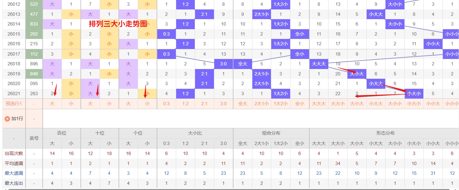 排列三 大小形态分析:从大小走势图上可以看出排列三100期内百位大小比约为53比47,十位大小比约为49:51,个位大小比约为52比48,除了个位和百位奇数比偶数多,十位偶数比奇数多。历史数据近2期开出小大小下一期的走势为,第297期开出小大小第298期开大大小。第303期开出小大小后第304期开小小小,第314期开出小大小后315期开大小小。近期排列三大小形态走势分析,“小小小”形态表现极为强势,连续多期开出或出现频率显著偏高,已形成明确的热态趋势。根据形态运行的惯性规律,此类热态组合往往具备一定的持续性,短期内存在继续连下的可能性,需作为重点跟踪对象。与此同时,“大大小”形态则已陷入长期的冷态区间,遗漏值较高,处于明显的休眠状态。所以排列三第2026022期大小形态推荐大大小小小小本文由一起彩钱是生命动力所著,请勿转载