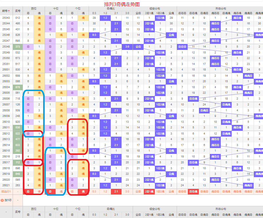 上一期的奇偶比为1:2,两偶的号码组合,从近五期的奇偶数出现情况看,奇数出6次,偶数出现9次,奇数号码出现较少,本期要侧重两奇的号码组合,侧重奇奇偶或偶奇奇的号码组合,根据奇偶组合形态可做五码定位13579/13579/02468或02468/13579/13579