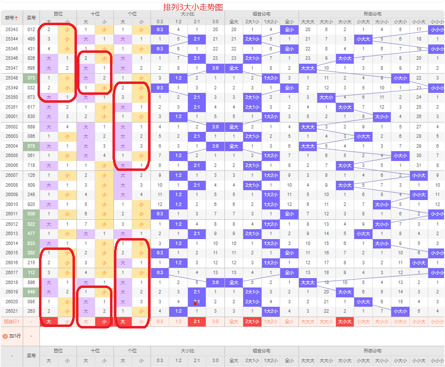 上一期大小比为1:2,俩小的号码组合,近五期大号出8次,小号出7次,大小号码出现较平均,上一期是两小的号码组合,本期侧重两大的号码组合,百位侧重大号码,十位侧重小号码,个位侧重大号码,侧重大小大或者小大大的号码组合,根据大小形态五码定位56789/01234/56789或者01234/56789/56789