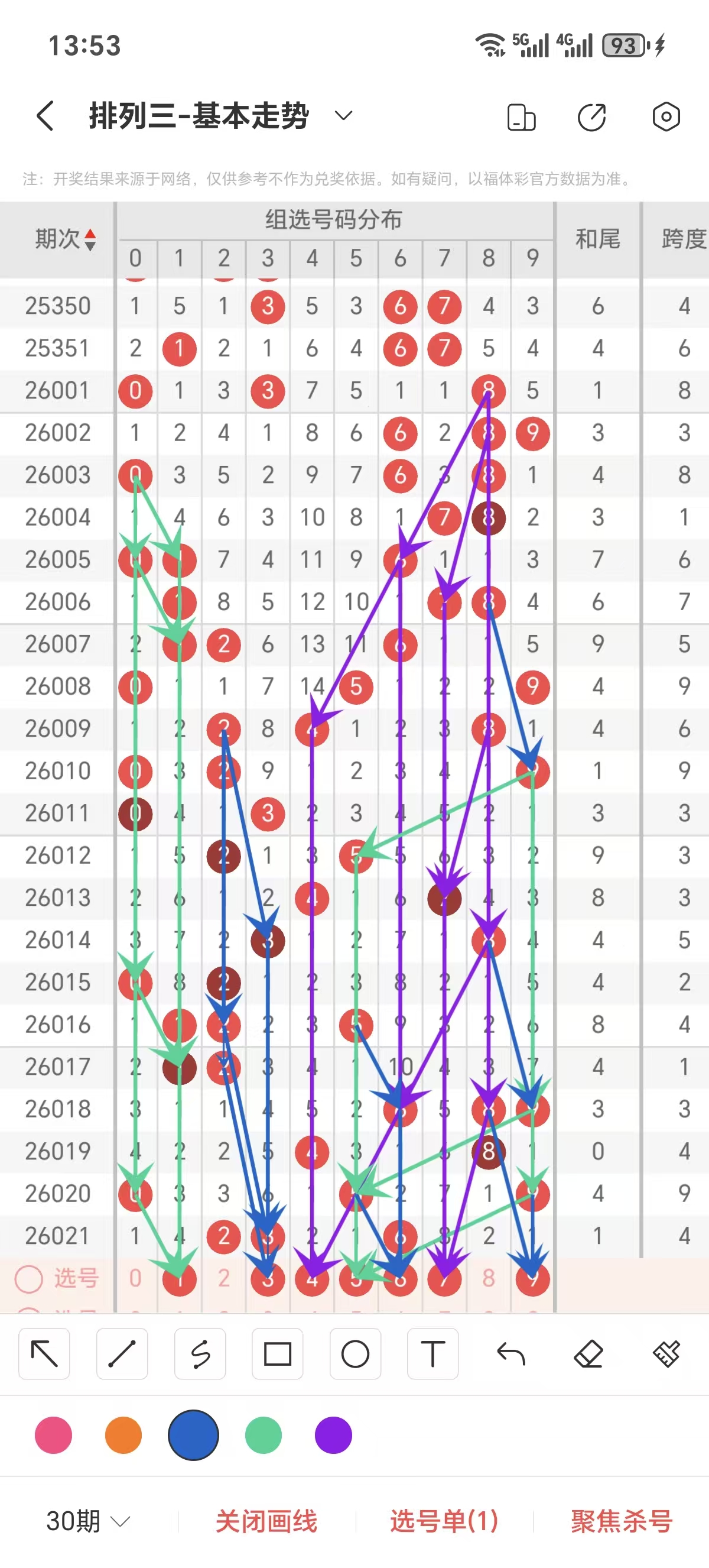 通常情况下在五期之内重复一个跨度的概率较高,近五期重复了4的跨度,近五期跨度为1/3/4/9/4,近期01路的跨度较热,本期要侧重3/5/8跨为主的号码组合。选择好跨度就可以从跨度方面选择相应的双胆码组合,双胆码的选取要根据近期和历史的走势进一步的分析选取。
