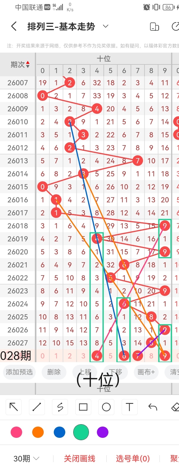 我们根据上图中画线的思路走势分析,号码3与前几期开出的号码呈连续隔六期回补的走势且呈斜三连的走位,跨度是1;号码4与前几期开出的号码呈直连回补的走位且呈斜三连的走势,跨度0;遗落14期未出的号码7与前几期开出的号码呈斜三连的走位,跨度为3;号码8与前几期开出的号码呈斜三连的走位且呈隔三期回补的走势,跨度4。综上所述,小梁本期推荐个位的号码是:3、4、7、8。
