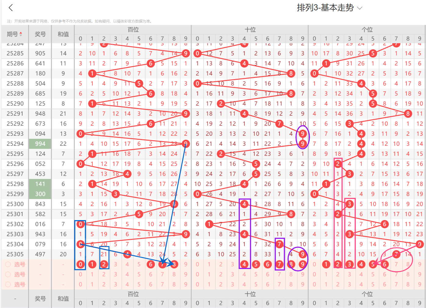 上一期百位开出号码为4,为偶数、小数、合数、1路号码:近10期百位较少开出59等号码,本期百位大概率仍然不会开出59等号码,因此本期百位选号时应该考虑59以外的号码,结合上述走势图看,本期百位看好012678等号码。