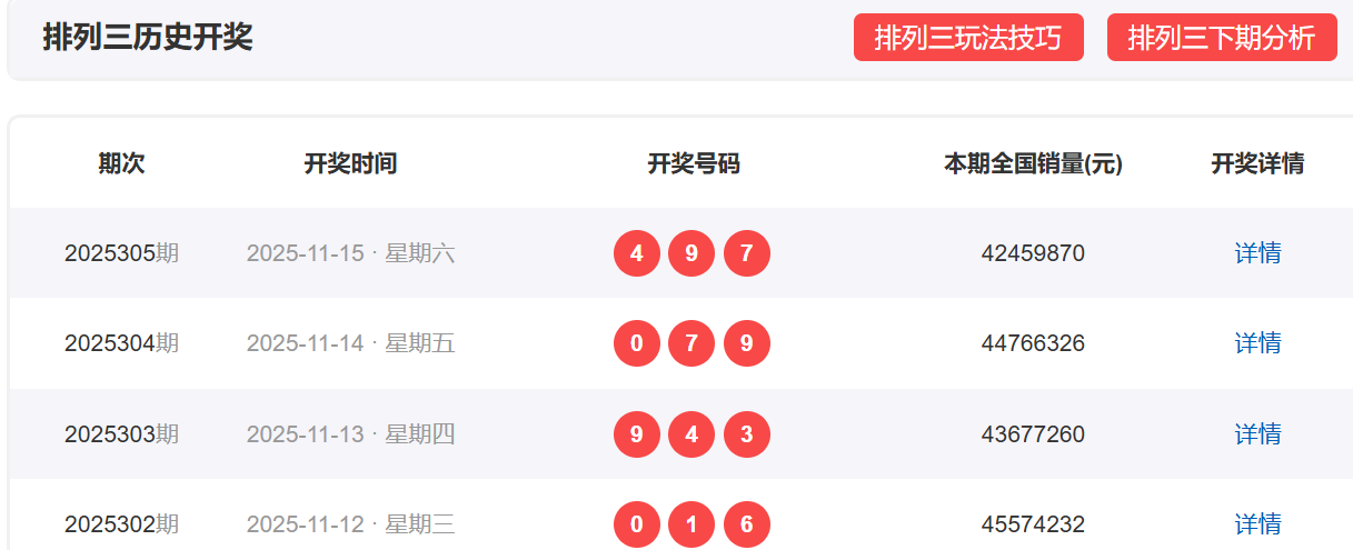 体彩排列3上一期,开奖号码为497,形态为组六,奇偶比为2:1,012路数值表现为101,和值20,和尾0,跨度5。