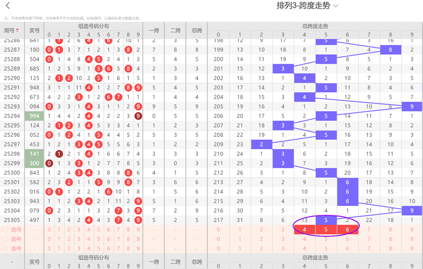 通过观察跨度及跨度属性走势可以发现:近10期内跨度01等号码遗漏值高,出号机会少,本期跨度开出01等号码的可能性小;因此本期跨度选号时应该优先排除01等号码,再结合上述走势图看,本期跨度看好456等号码。
