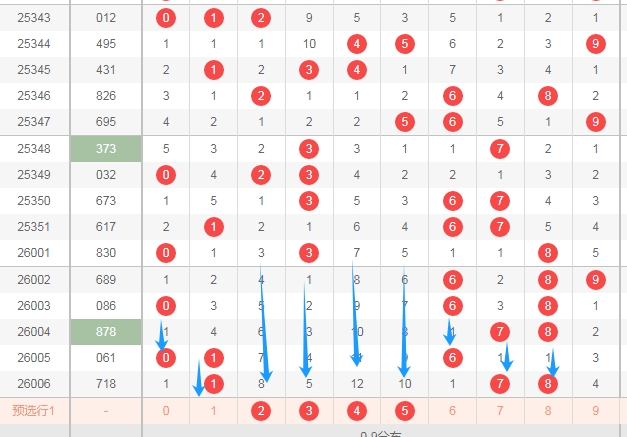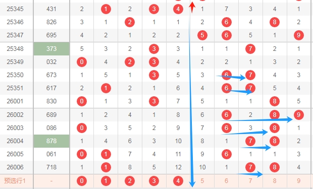 上图是体彩排列三开奖号码分布走势图,我在上面走势图中标注出来的蓝色大箭头把10个数字分为两边,蓝色箭头的右边数字可以看到的就是最近开出的比较多,那么本期个人觉得蓝色箭头的左边数字0 1 2 3 4可以关注出2个或者3个。