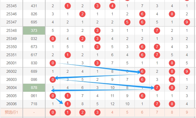 上图是体彩排列三开奖号码分布走势图,我在上面走势图中标注出来的数字2 3 4 5都是遗漏周期大的,标注出来的蓝色小箭头表示的遗漏周期小的数字,上期开出的数字1 7 8这三个数字的遗漏周期都是小的,看上面标注出来的蓝色小箭头可以发现的就是最近两期开出的号码都是遗漏周期小的数字,那么本期个人觉得应该要去关注那些遗漏周期大的数字,刚好数字2 3 4 5遗漏周期大,关注这四个数字出1个或者2个。