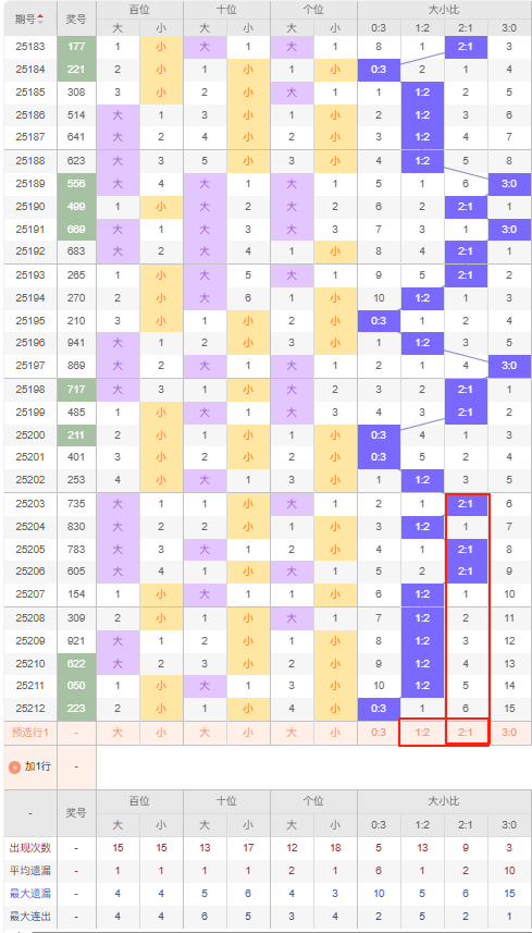 上期大小比:0:3,近10期大小比出现情况:2:1、1:2、2:1、2:1、1:2、1:2、1:2、1:2、1:2、0:3,最近10期出3期2:1,出现6期1:2,出现1期0:3,出现0期3:0,根据近10期出号规律本期看好小号,推荐隔期开出1:2,防遗漏6期的2:1,综上所述大小比推荐:防:2:1,重点关注:1:2。