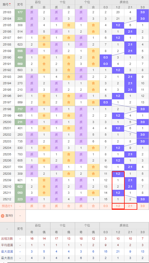上期质合比:3:0,近10期质合比出现情况:3:0、1:2、2:1、1:2、2:1、1:2、2:1、2:1、1:2、3:0,最近10期出现4期2:1,出现4期1:2,出现0期0:3,出现2期3:0,根据近10期规律本期看好合数,推荐隔期开出1:2,防遗漏2期的2:1,综上所述质合比推荐:防:2:1,重点关注:1:2。