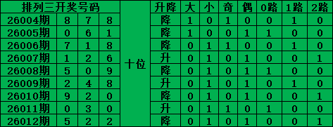 排列三是从0-9每期开出3个号码,截至2026012期三个位置最大遗漏的是25期的:个位的4号。