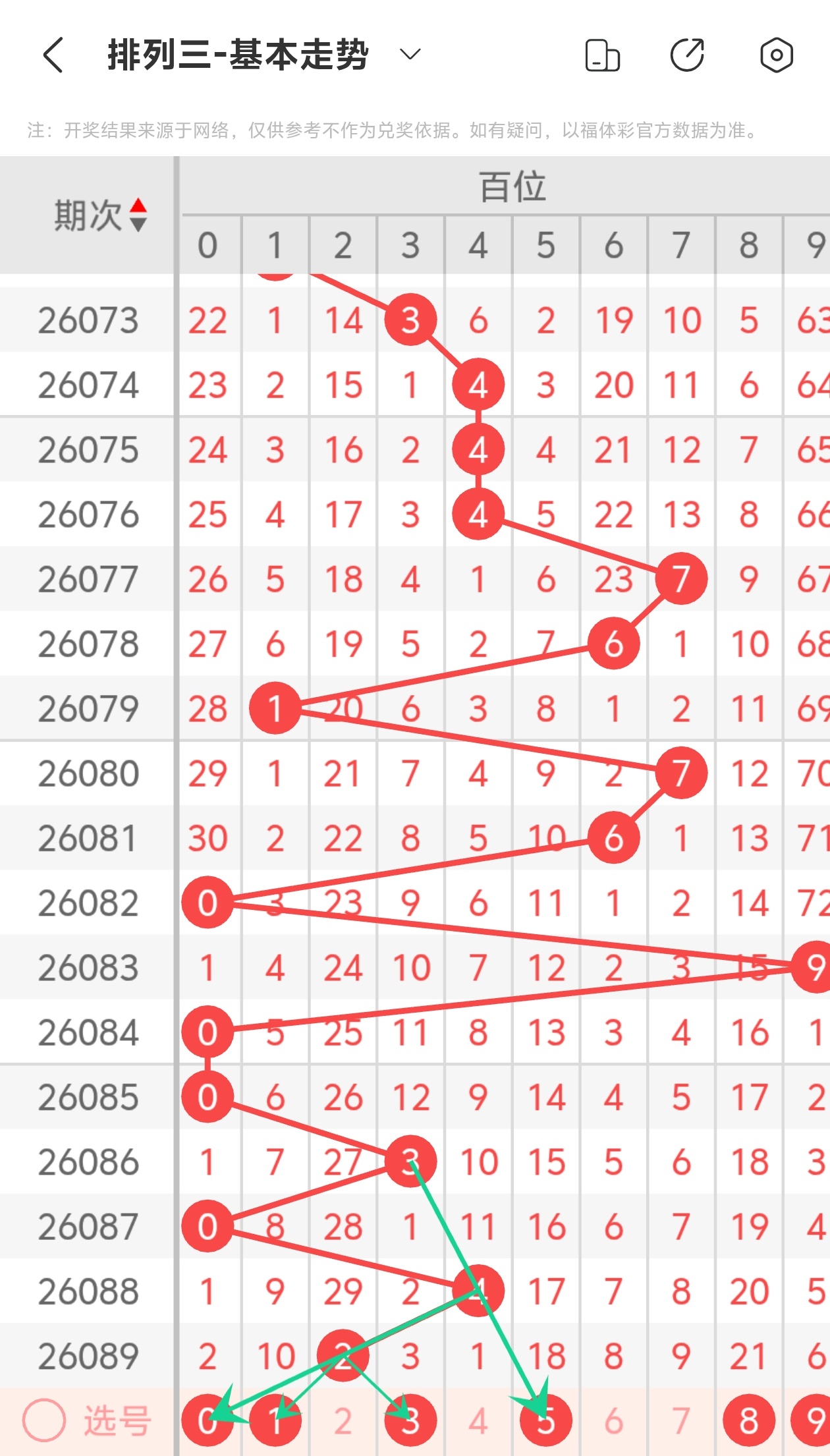 上期百位开出2,本区与上期的跨度为2,本期我们可以从上面走势图中看出选号的思路,0为斜连走势跨度为二,1和3为分边走势,5为斜连走势跨度为三,综合以上分析,本期百位推荐:013589