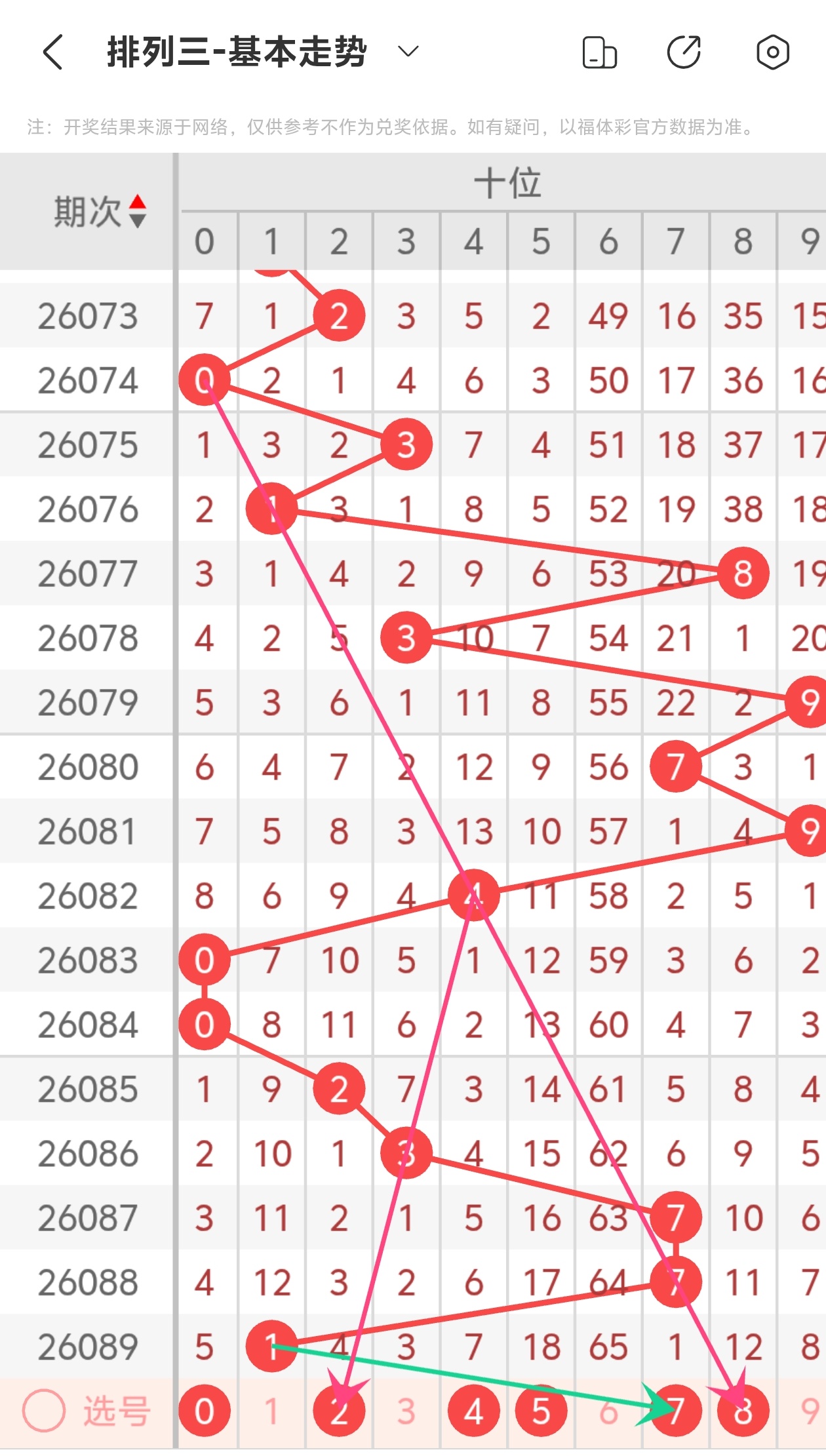 上期十位开出1,本区与上期的跨度为6,本期我们可以从上面走势图中看出选号的思路,2为斜连走势跨度为一,7为隔期回补号,8为斜连走势跨度为七,综合以上分析,本期十位推荐:024578