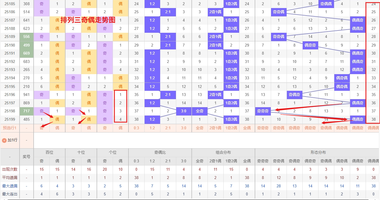 排列三 奇偶分析:从上图可以看出排列三100期内百位奇偶比约为52比48,十位奇偶比为55比45,个位奇偶比为46比54,百位的比值比较均衡,但是个位的比值偏差就有点大,历史奇偶形态近2期开出偶偶奇后下一期的走势为,第112期开出偶偶奇后113期开奇偶偶, 第125期开出偶偶奇后第126期开偶奇偶,第131期开出偶偶奇后第132期开偶偶偶。近期排列三奇偶走势中,奇偶偶和偶奇偶组合表现较为温和,出现频率有所回升,呈现转热迹象,可适当关注其延续性。而偶偶偶组合则持续冷态,多期未见回补,遗漏值较高,需重点防范其突然解冻。在投注策略上,以温热的奇偶偶和偶奇偶为主,同时兼顾冷态偶偶偶的回补可能,适当采用冷热搭配的方式布局。所以排列三2025200期奇偶形态推奇偶偶与偶奇偶。本文由一起彩钱是生命动力所著,请勿转载