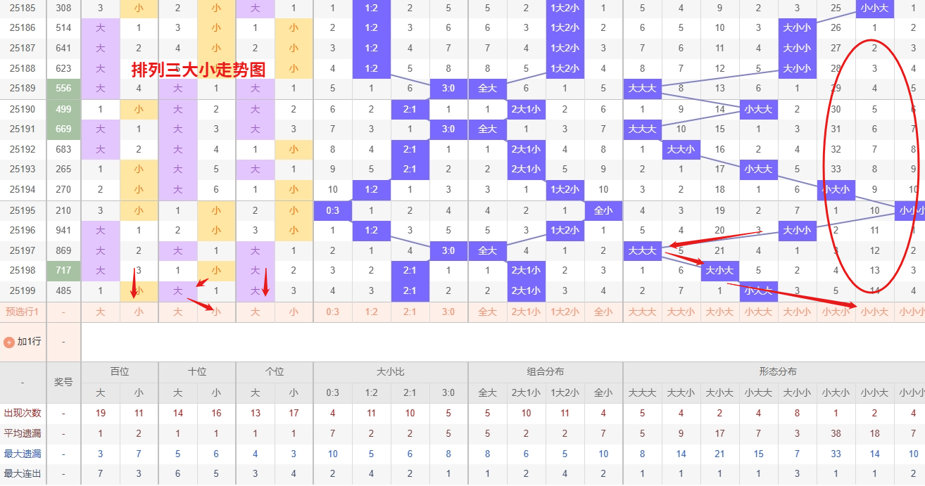 排列三 大小形态分析:从大小走势图上可以看出排列三100期内百位大小比约为48比52,十位大小比约为47:53,个位大小比约为55比45,除了百位和十位奇数比偶数多,个位是偶数比奇数多。历史数据近2期开出小大大下一期的走势为,第106期开出小大大第107期开小小小。第112期开出小大大后第113期继续开小大大,第125期开出小大大后126期开小大小。近期排列三大小走势中,小大大组合虽然刚刚开出,但整体表现活跃,近期热度较高,仍有连开可能,可继续跟进其热态走势。而小大小组合则持续低温,遗漏值不断攀升,冷态明显,需警惕其回补反弹。此外,小小小组合近期频繁现身,成为热号焦点,短期内仍需防范其再次开出。以热态小大大为主攻方向,同时兼顾冷态小大小的回补机会,并适当防守小小小的续热可能。所以排列三第2025200期大小形态推荐小小小防小大大。本文由一起彩钱是生命动力所著,请勿转载