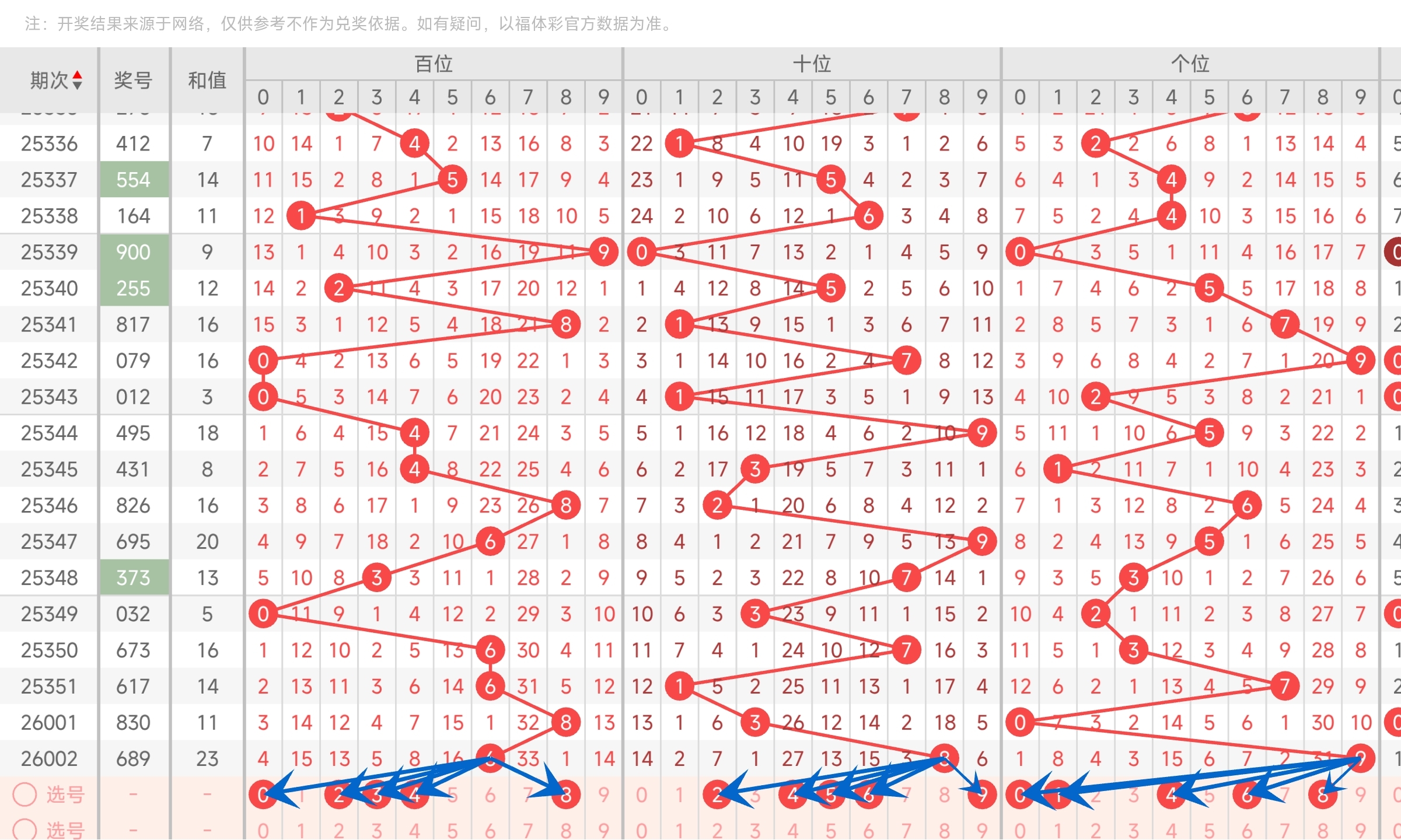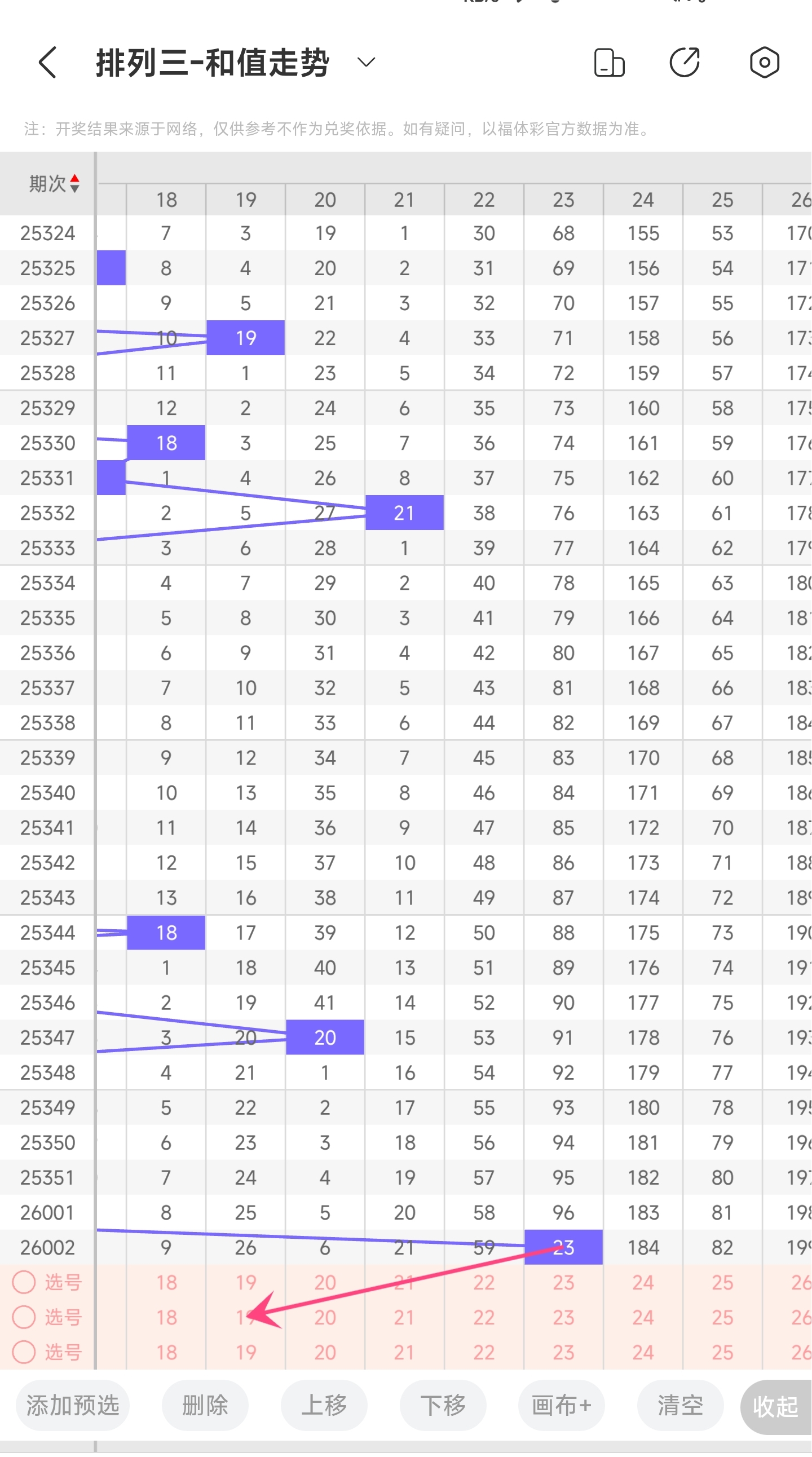 上期和值为23,往前一期和值为11,趋势往右移动,偏移量为12。通过走势图分析,23和值是近30期内开出最大的和值,下降空间非常大,上升空间非常小。本期看好和值变小,因此推测本期趋势是往左的,和值会变小,小概率往右,和值变大。