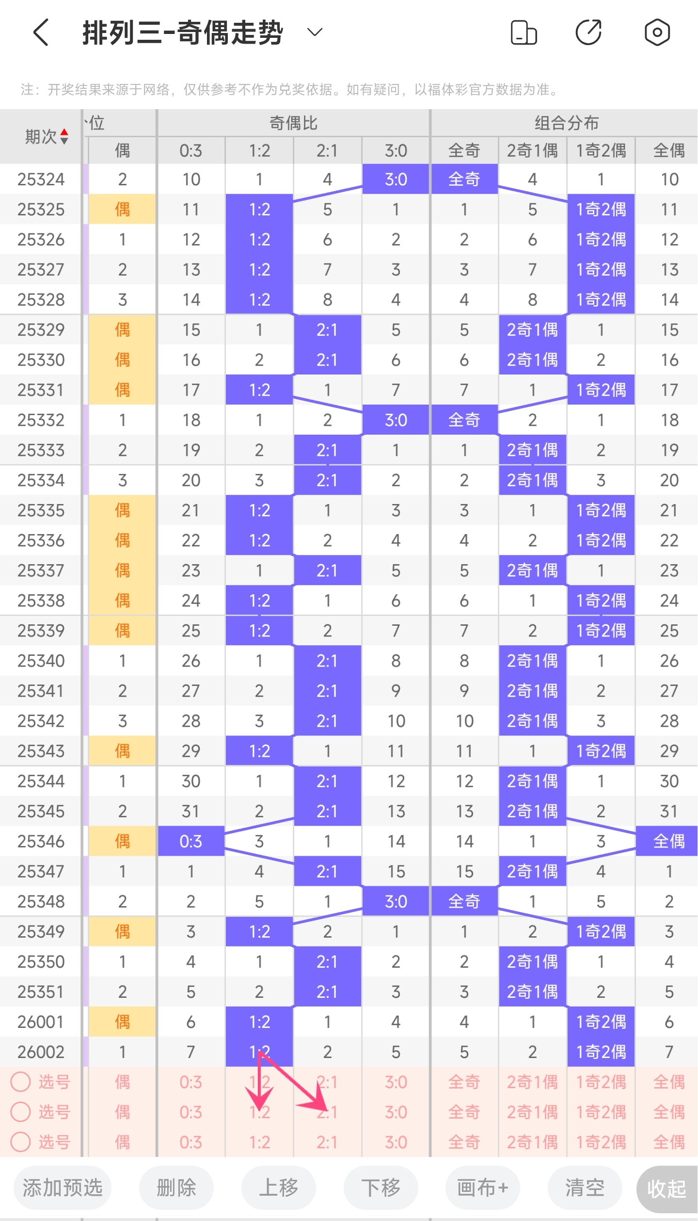 上期开出了1:2的奇偶比。往前一期是1:2奇偶比。通过分析奇偶走势图,近30期内开出1:2奇偶比的次数是13次,开出2:1奇偶比的次数是13次,3:0是3次,0:3是1次。和前一期相比,次数没有变化。通过走势图分析,可以看到2:1和1:2开出次数一样了,本期开哪个都有可能,本期比较看好2:1奇偶比。所以推测本期可能开2:1奇偶比,其次是1:2奇偶比,最后是3:0或者0:3奇偶比。