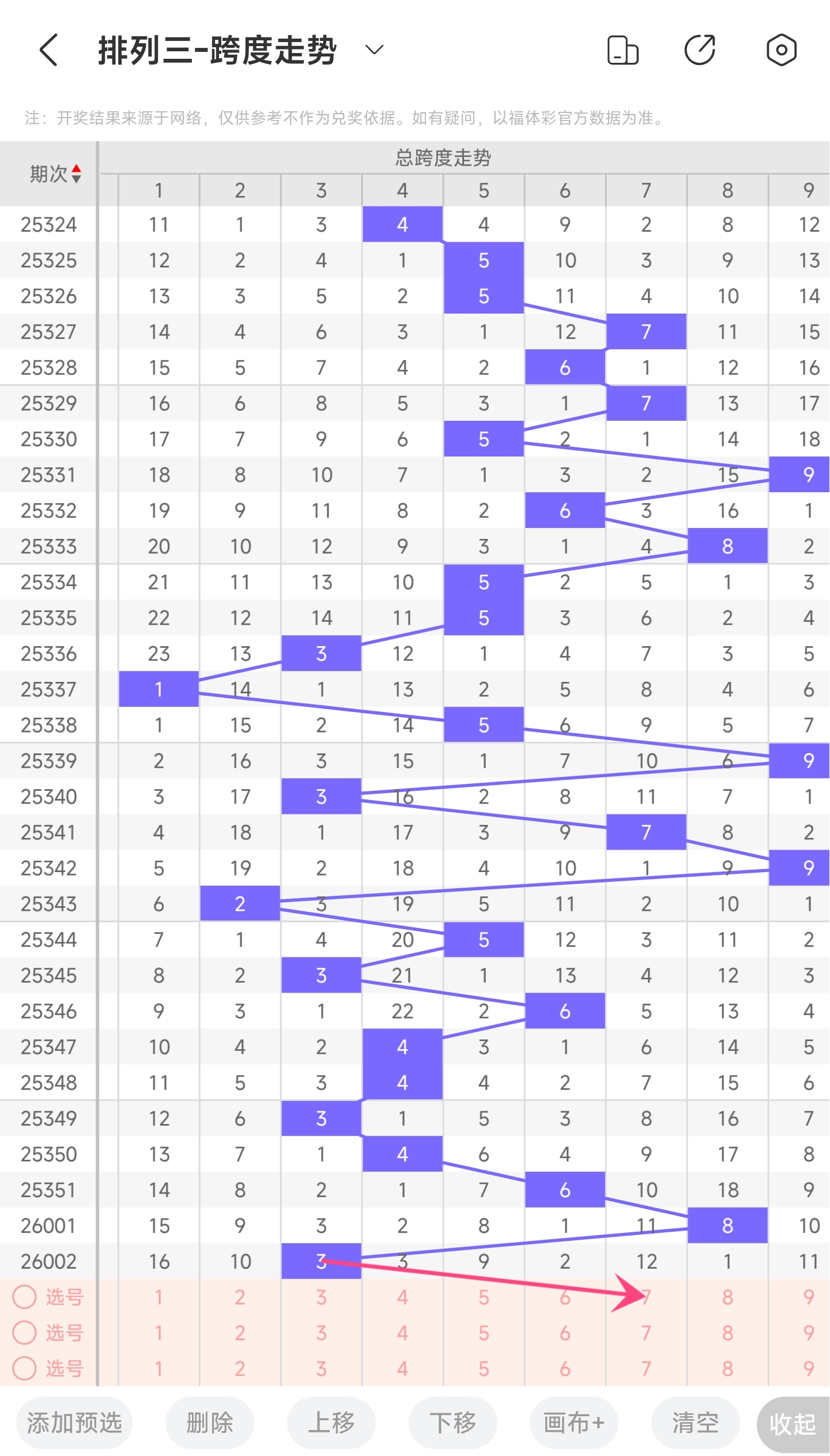 上期跨度为3,往前一期跨度是8,趋势往右移动,偏移量为5。跨度值3时,跨度值是近30期内开出比较小的值。通过走势图分析,目前的趋势是大概率往右,小概率往左。所以推测本期跨度可能为45678等跨度。