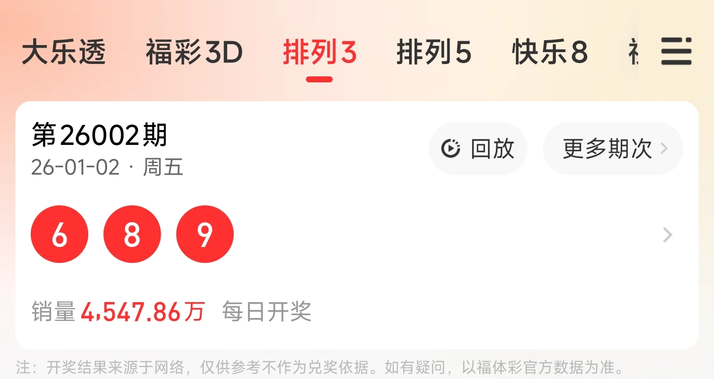 上期排列3开出689,和尾为3,跨度为3,奇偶比为1:2,大小比为3:0,012路个数对比为2:0:1。