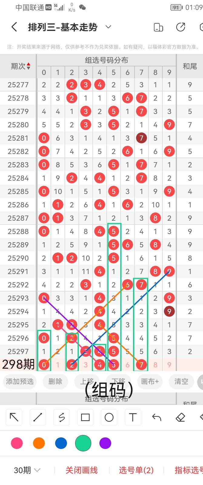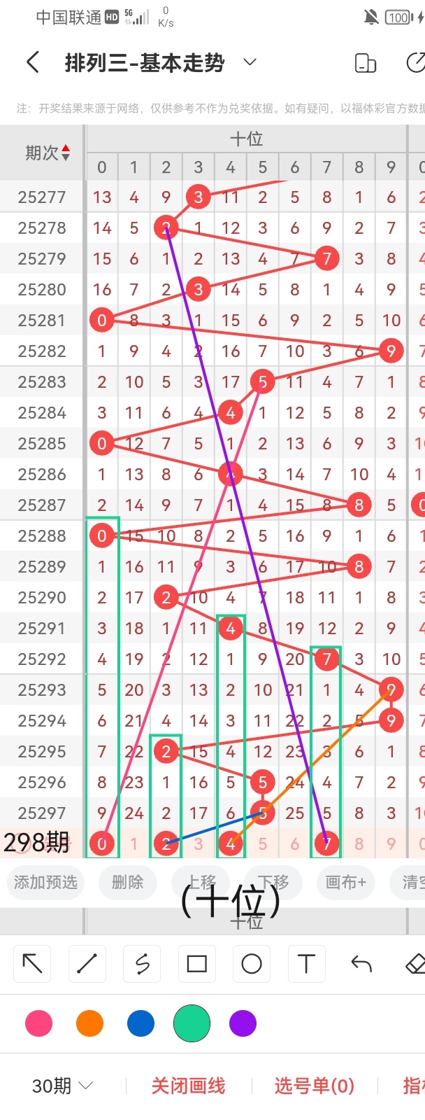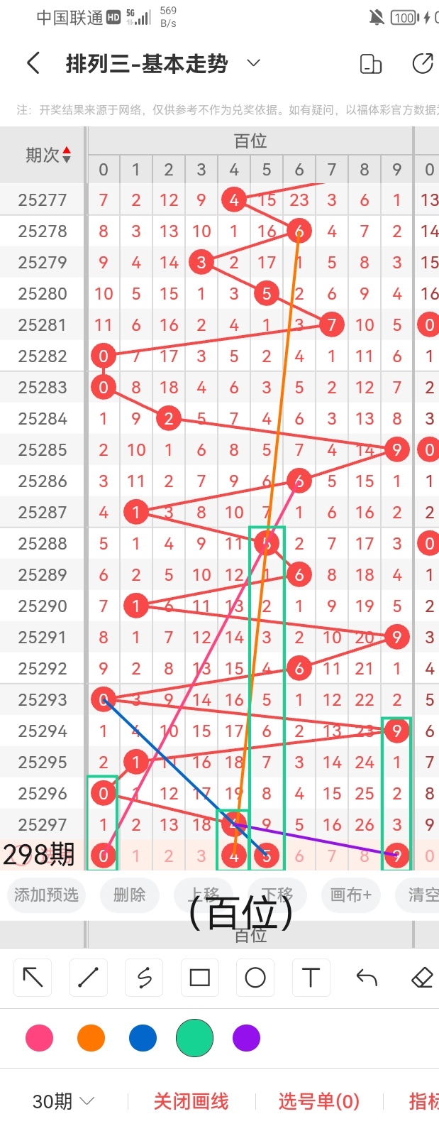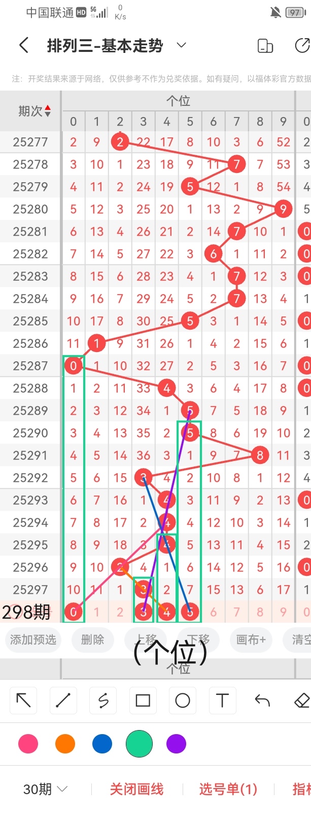 通过以上对上期的简单回顾,下面进入体彩排列三第2025298期(下面简称本期)的选号分析: