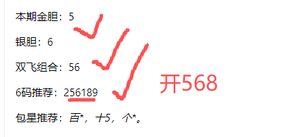 首先来看上期开奖号码为:568,和值为19,上期金银双胆都对,6码中组六等
