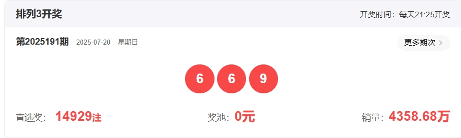 排列三第2025191期开奖回顾:开奖号码:669 形态:组三