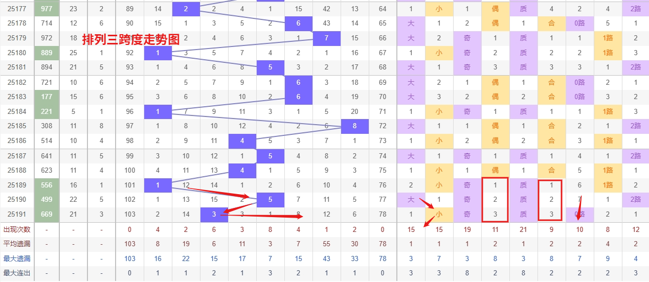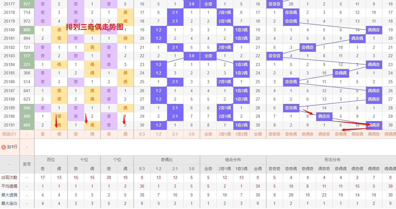 排列三 奇偶分析:从上图可以看出排列三100期内百位奇偶比约为53比48,十位奇偶比为54比46,个位奇偶比为49比51,个位的比值比较均衡,但是百位的比值偏差就有点大,历史奇偶形态近2期开出偶偶奇后下一期的走势为,第102期开出偶偶奇后103期开偶奇偶, 第118期开出偶偶奇后第119期开奇偶偶,第122期开出偶偶奇后第123期开偶偶偶。近期排列三奇偶走势中,偶奇偶和偶偶偶组合明显偏冷,尤其是偶偶偶形态已遗漏长达30期未出,远超历史平均遗漏值,回补压力逐渐增大。从历史规律来看,此类冷态组合一旦进入高遗漏阶段,往往会在短期内迎来反弹,需重点防范其突然回补。与此同时,其他热态奇偶组合奇偶偶仍可适当关注,在追热的同时,也要警惕冷态偶偶偶的爆发可能,所以排列三2025192期奇偶形态推偶奇偶与奇偶偶。本文由一起彩钱是生命动力所著,请勿转载