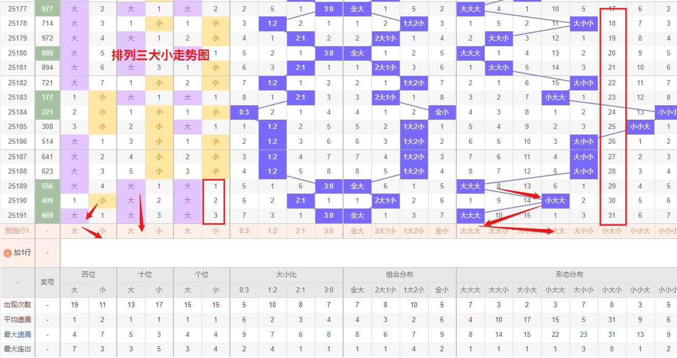 排列三 大小形态分析:从大小走势图上可以看出排列三100期内百位大小比约为48比52,十位大小比约为49:51,个位大小比约为55比45,除了百位和十位奇数比偶数多,个位是偶数比奇数多。历史数据近2期开出大大大下一期的走势为,第095期开出大大大第096期开大小小。第102期开出大大大后第103期开大小大,第115期开出大大大后116期开小大小。可以看出开出大大大的时候,结合遗漏数据再加上开出大大大形态后容易进行下一个类型变化。近期排列三大小走势中,"大小小"组合表现活跃,成为热号形态,短期内存在连开可能性需重点跟踪。同时需警惕冷态回补:"大小大"组合呈现偏冷态势,而"小大小"更是遗漏已达31期,远超理论出现周期(理论上每8期出现1次),冷号反弹压力逐渐增大。采取"热号跟进+冷号防守"的复合策略,对"小大小"可适当采用间隔倍投法进行布局 ,所以排列三第2025192期大小形态推荐大小小防大小大。本文由一起彩钱是生命动力所著,请勿转载