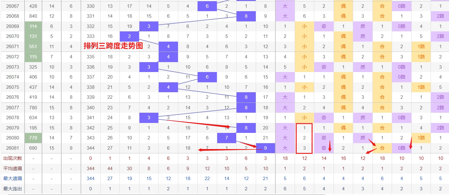排列三走势分析:从上图可以看出百位号码连线走势到大偶数6,近10期内大数小数之间基本均衡,近期大数空缺较多有走向大数的势头。上期开出奖号6,回补了大偶数0路号码的不足符合我们的预期。前10次百位开出奖号6之后,其下期分别开出码:514521337,其中号码奇偶比约为6:4,大小比约为5:5, 从排列三百位走势来看,0和9目前均处于冷号状态,遗漏值已远超平均周期,从号码平衡和冷热回补的规律分析,这两个号码作为百位上的两端极值,往往会在盘面出现小号回温或大号反弹时集中释放,尤其是0路号码整体热度回升的阶段,0和9的冷态突破概率正在显著累积;而3则属于温号区域,近期出现频率稳步提升,且与热门的跨度、和值形态形成较好的联动,从温转热的迹象较为明显,这种温号往往具备较强的过渡性和延续性,容易在冷热交替的节点上率先走出连续开出的节奏。本期该位注意号码:02389,排列三十位走势近期小数一直占据上风比较强势且出号热号区一直处于小数,回补了一期小数后有返回大数的可能,第2026080期开出大奇数7, 排列三十位走势来看,5目前处于温号区域,但近期出现频率稳步提升,与热门的跨度、和值形态联动性较强,从温转热的迹象较为明确,这种温号往往具备良好的延续性,容易在十位中区形成连续开出的节奏;而6则属于明显的冷号状态,遗漏多期未出,从冷热平衡和概率回补的角度分析,这种长期缺失的号码在十位上的反弹需求正在不断累积,尤其是当盘面出现中区号码回温或0路号码联动时,6的冷态突破概率显著增加。所以第2026082排列三十位看好14567,个位经过2期的奇数回补后走偶数的可能开出号码0符合我们的预期,本期有走偶数的迹象。连线走势上到小偶0,0路号码偶数,从排列三个位走势来看,2和6目前均处于冷号状态,遗漏时间较长,从冷热平衡和概率回补的角度分析,这两个号码作为个位上的中小区间代表,往往会在盘面出现小号回温或0路号码反弹时集中释放,尤其是当整体跨度偏向小跨或和值处于低位区间时,2和6的冷态突破概率正在显著累积;而9则属于明显的热号,近期出现频率较高且走势连贯,这种热号往往具备较强的惯性,尤其是在个位大号区活跃的阶段,9容易延续其热出节奏,与热门的奇偶搭配或跨度形态形成共振。所以排列三第2026082期个位推荐24679。