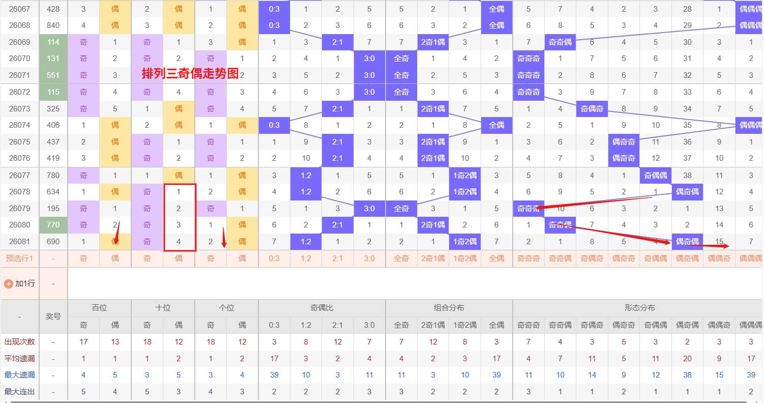 排列三 奇偶分析:从上图可以看出排列三100期内百位奇偶比约为48比52,十位奇偶比为54比46,个位奇偶比为51比49,个位的比值比较均衡,但是十位的比值偏差就有点大,历史奇偶形态近2期开出偶奇偶后下一期的走势为,第005期开出偶奇偶后006期开偶奇奇, 第014期开出偶奇偶后第015期开偶偶奇,第033期开出偶奇偶后第034期开偶偶偶,排列三近期奇偶走势来看,偶偶偶和偶偶奇这两种形态均处于温号区域,但近期出现频率已有明显抬头的迹象,尤其是偶偶偶的全偶组合,在经历了一段较长时间的沉寂后,近期连续出现且与热门的跨度、和值形成共振,往往预示着全偶形态即将进入活跃周期;而偶偶奇作为“两偶一奇”的代表形态,近期不仅在整体出号中占比稳步上升,而且常常作为全偶形态与常规奇偶搭配之间的过渡角色出现,具备较强的衔接性和延续性。所以排列三2026082期奇偶形态推偶偶偶与偶偶奇。