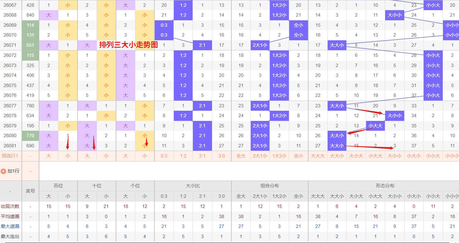 排列三 大小形态分析:从大小走势图上可以看出排列三100期内百位大小比约为45比55,十位大小比约为49:51,个位大小比约为54比46,除了个位和百位奇数比偶数多,十位偶数比奇数多。历史数据近2期开出大大小下一期的走势为,第004期开大大小后第006期开大小大。第016期开出大大小后第017期开大大大,第032期开出大大小后033期开小大小。 排列三近期大小走势来看,大小大目前处于明显的热号状态,近期出现频率较高且走势连贯,这种热号形态往往具备较强的惯性,尤其是在整体大小分布偏向两端突出的阶段,大小大容易连续开出,形成热号连下的节奏,同时与热门的跨度、和值区间配合度较高,具备较好的延续基础;而小大小则属于典型的冷号形态,近期遗漏时间较长,从冷热平衡的角度看,其回补需求正在逐步累积,尤其是在盘面出现小号回温或大小交替频繁的走势时,小大小这类冷态形态往往容易冷不防地反弹。所以排列三第2026082期大小形态推荐大小大防大大大。