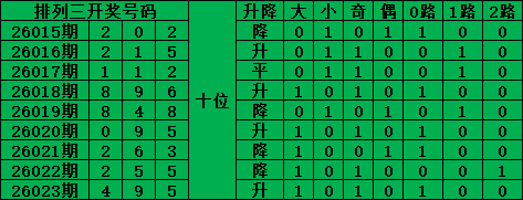 排列三是从0-9每期开出3个号码,截至2026023期三个位置最大遗漏的是36期的:个位的4号。