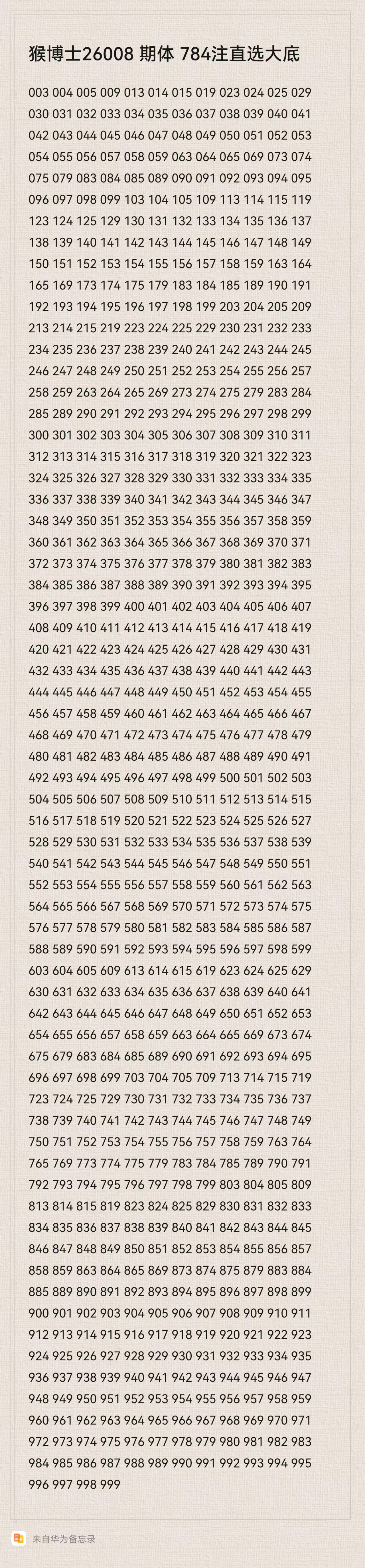 猴博士26008期排列三784注直选大底:(可以当母底用,然后进行缩水)