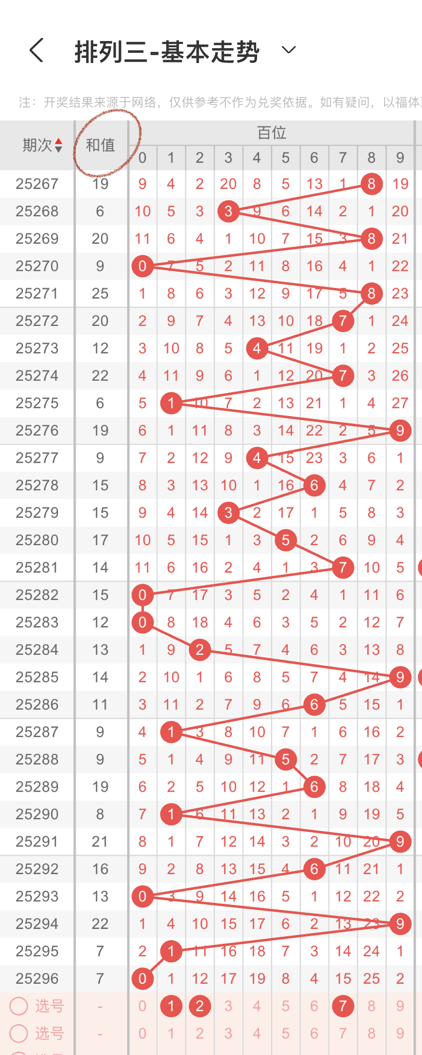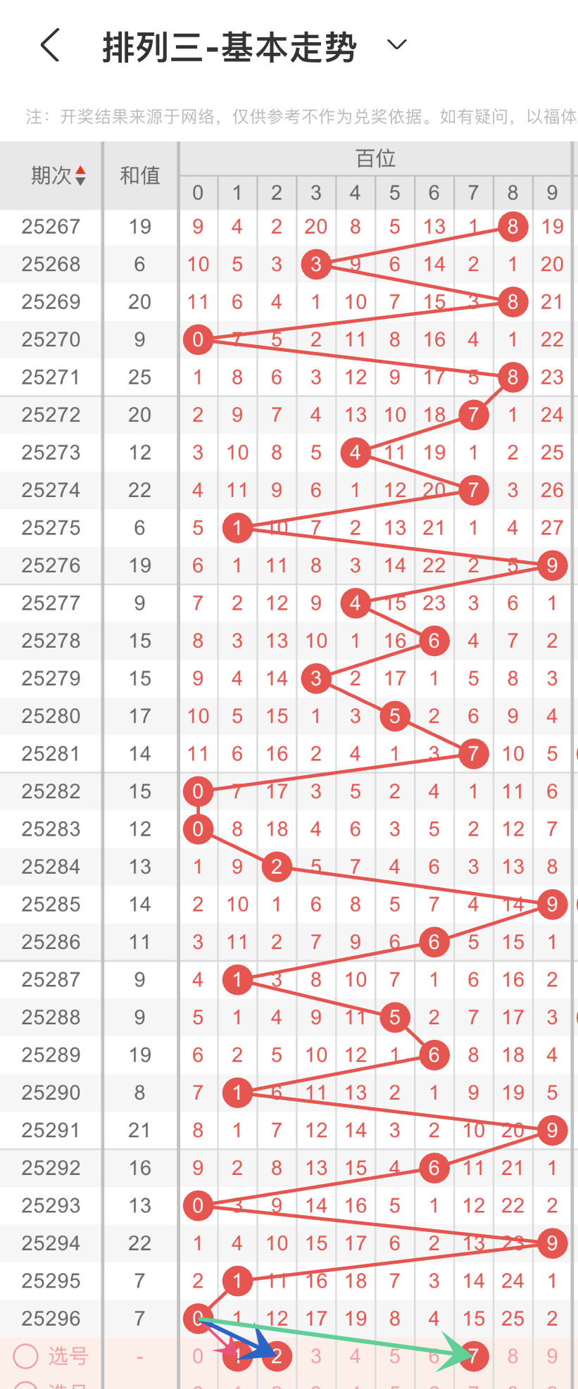 结合上面的大小、奇偶以及012路比,我们可以得到的数据分别是第一组56789,第二组13579,第三组147,我们重点选择3组数据中重复的,那百位我们选择7,防2路的2,1路的7,综上所述百位选127