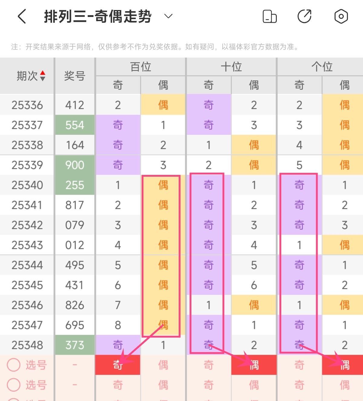 上期奇偶形态为奇奇奇,奇偶比为3:0,奇数占优,全奇组合。根据近期奇偶形态变化来看,上期奇偶形态开出全奇组合较为极端,本期需注意偶数号码的反弹,预计本期奇偶形态会回补偶数号码占优组合。