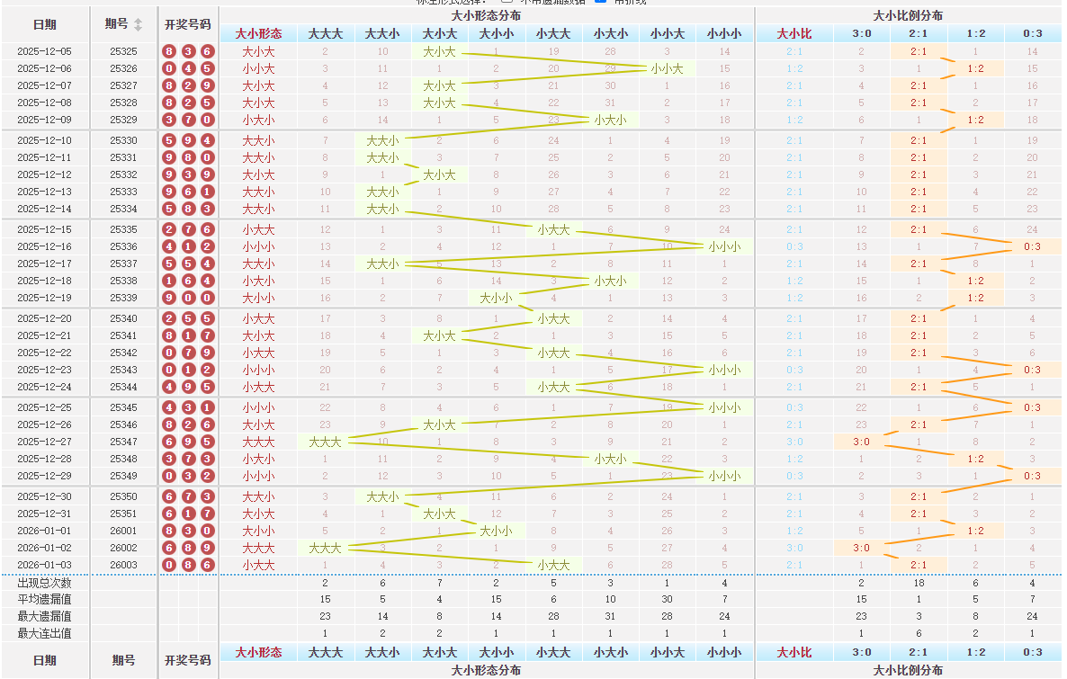 通过以下数据可以看到近30期大小号分布及遗漏