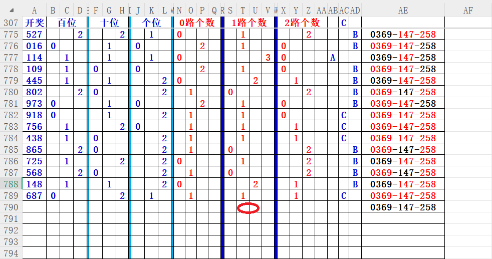 如上图56,012路分析0路出号的概率还是很大,本期可以0路号入手做胆0369中选;看好369胆码