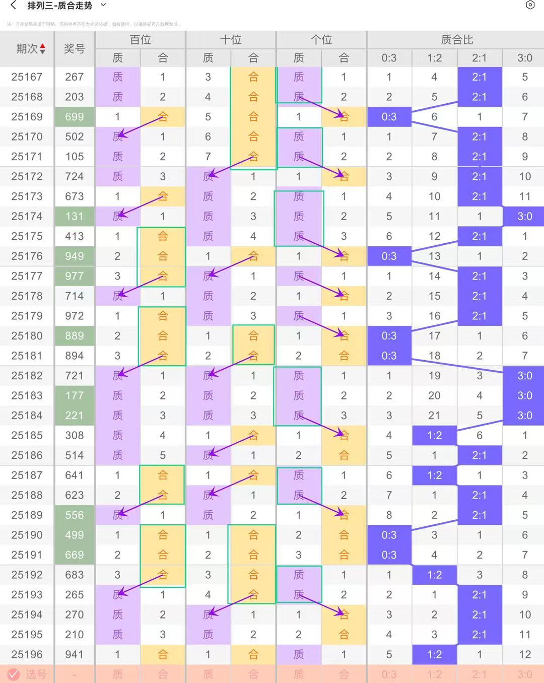 百位质合常以连下周期呈现,方框标注的连下区间内,质或合持续占据落点,形成短期主导。连下结束后,回补并非一蹴而就,箭头指向的回补形态,会以渐进渗透的方式填补空缺。比如,某段合数连下周期,百位持续出合,结束后质数并非一次性回补,而是交替、零散地出现,打破连下后的形态空白。可关注连下周期的长度,连下越久,回补的分步特征越突出,质合切换的过渡周期越长,本期参考合数连下(04689)
