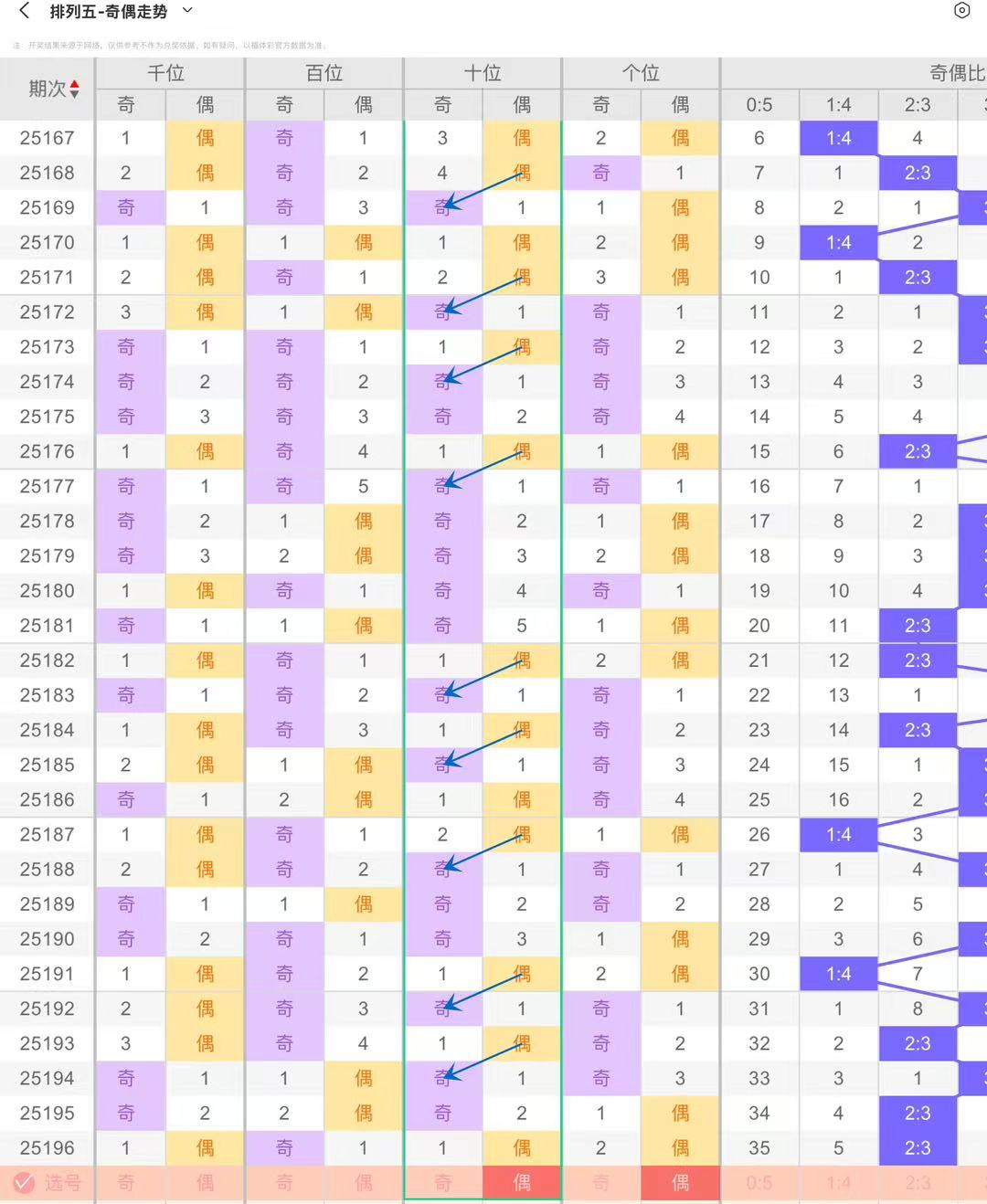 根据上图排列五个位奇偶形态走势分析,偶数连下后,奇数常回补,奇数连下时,偶数也会反向填补 。连下阶段,奇偶可连续多期占据个位,形成稳定连落区间;连下结束,箭头指引回补方向,二者相互平衡路数空缺。可关注连下期数与回补节奏,连下越久,回补需求越突出,紧盯连下延续长度和回补衔接节点,本期参考偶数连下(02468)