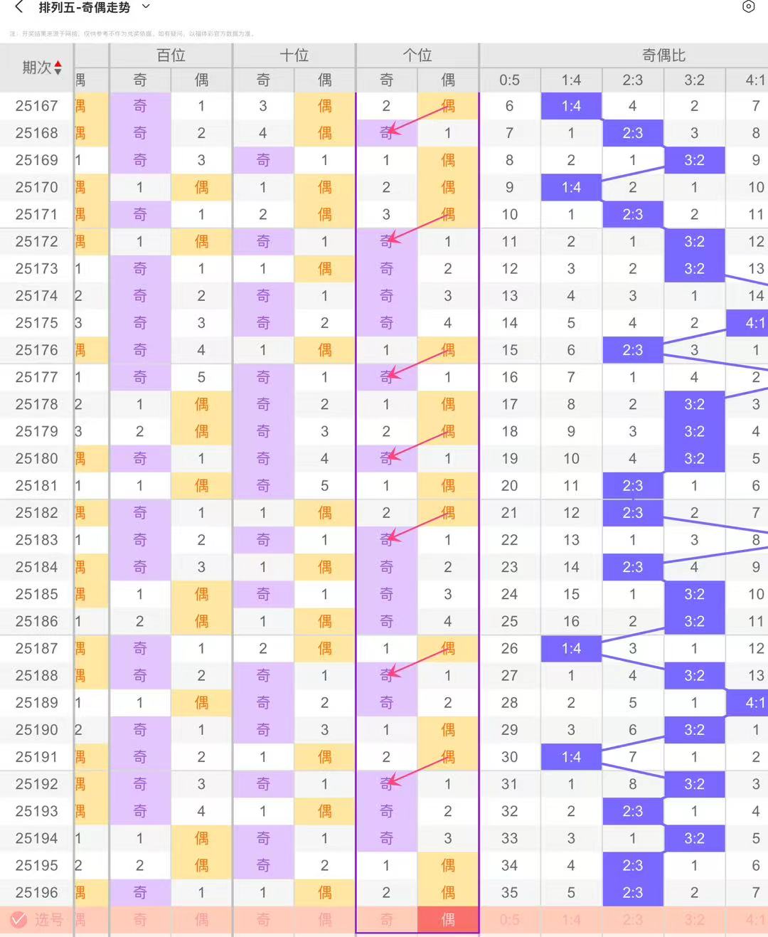 根据排列五十位奇偶形态走势分析,奇数与偶数呈现交替循环特征。偶数连下后,常伴随奇数回补,反之亦然。连下阶段,奇偶会持续占据十位多期,形成相对稳定的连落区间;连下结束,箭头指示回补方向,奇数与偶数相互填补空缺。可观察连下期数与回补节奏,连下越久,回补需求越明显,需紧盯连下延续长度与回补衔接节点,辅助预判十位奇偶走势,本期参考偶数连下(02468)