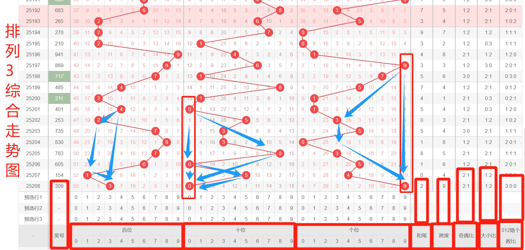 体彩排列3第20250208开奖号码为309,形态为组六,奇偶比2:1,和值12,跨度9,大小比1:2,【012】路个数比3:0:0。